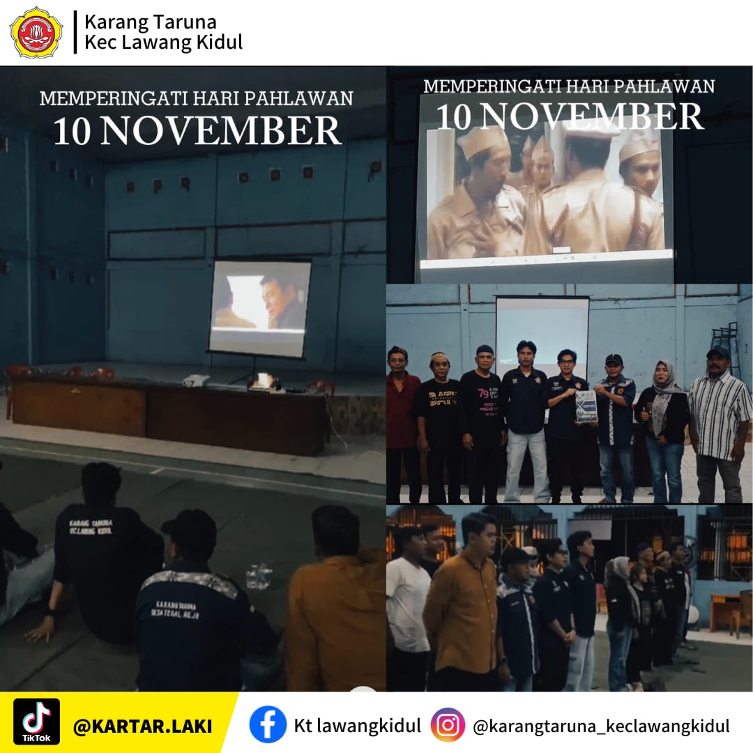 Dalam rangka memperingati Hari Pahlawan yang jatuh pada Tanggal 10 November. Karang Taruna satya muda Desa Tegal Rejo mengajak seluru lapisan masyarakat baik dari kalangan pemuda pemudi, Tokoh masyarakat, Pemerintahan Desa Tegal Rejo, Kadus, RT untuk mengenang jasa pahlawan yg kami rangkum dalam acara Nonton Bareng film pahlawan dengan judul film Jendral Soedirman di balai adat guno mulyo Desa Tegal Rejo. Di Momentum yang sama juga Adi Saputra selaku Ketua Karang Taruna Kec Lawang Kidul juga menyerahkan Buku Pedoman Karang Taruna kepada Pengurus Karang Taruna Desa Tegalrejo dan dilanjutkan dengan poto Bersama.